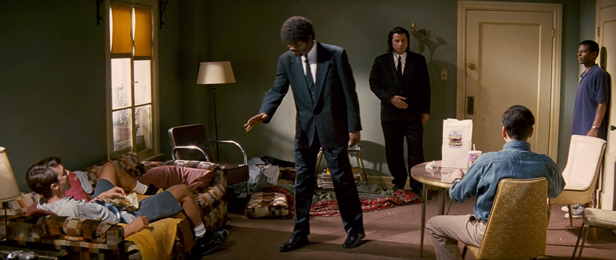 Lo mismo pasa con la escena en que Julius (Samuel L. Jackson) y Vince (John Travolta), en Pulp Fiction (1994), entran en la casa de unos chavales a recuperar un maletín. No se sabe exactamente qué es lo que han hecho esos chicos, aunque se deduce, y tampoco importa un pito. Lo que se sabe es que van a acabar a tiros desde el momento uno, pero la tensión de ver venir lo que va a pasar, como una espada de Damocles en el ambiente, da tensión a toda la escena. Por si eso fuera poco, Tarantino nos regala con ese momento en el que Vince saca la pistola y se queda tranquilamente esperando a que su compañero termine su monólogo. En ese momento, está claro lo que va a pasar, que ese chaval no se salva ni de casualidad, pero aún así, y pese a lo largo del discurso de Julius, no podemos evitar ver la escena completa, hasta el final.